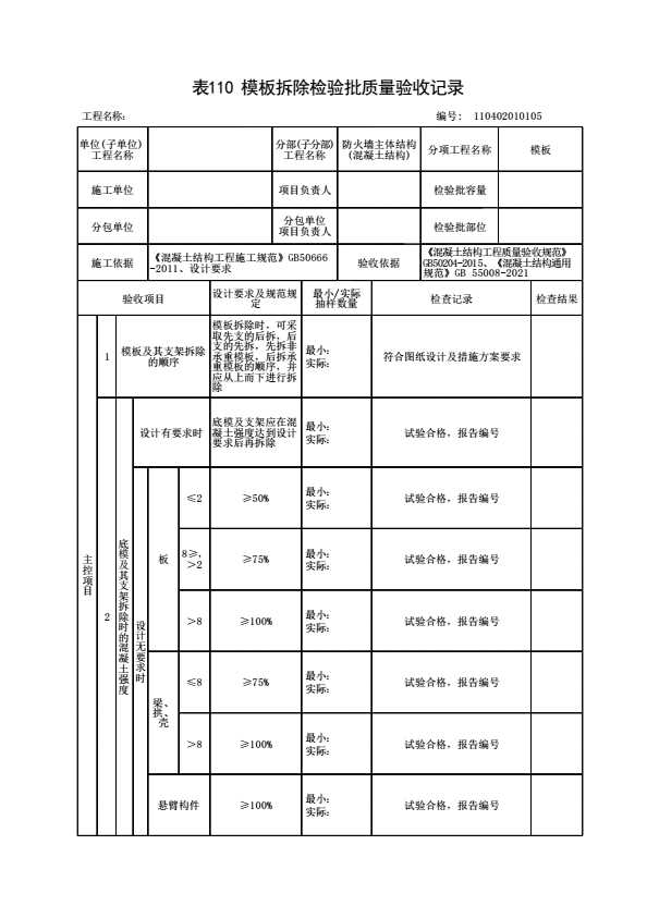 表格名称:110402010105 模板拆除检验批质量验收记录