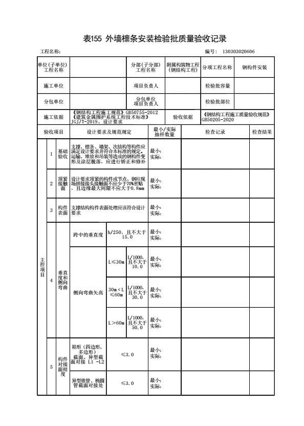 表格名称:130303020606 外墙檩条安装检验批质量验收记录
