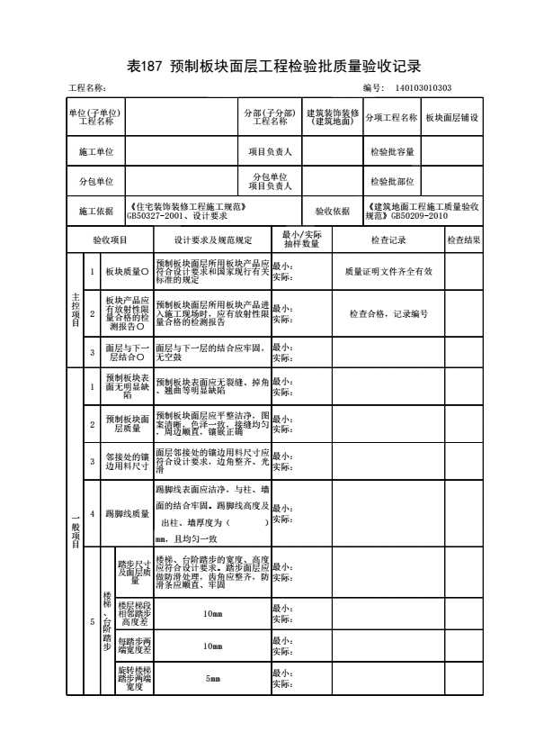 表格名称:140103010303 预制板块面层工程检验批质量验收记录