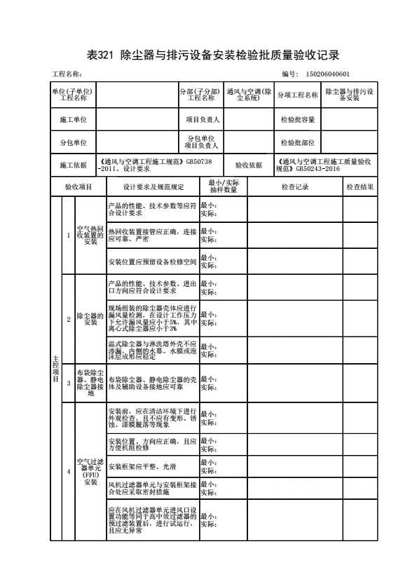 表格名称:150206040601 除尘器与排污设备安装检验批质量验收记录
