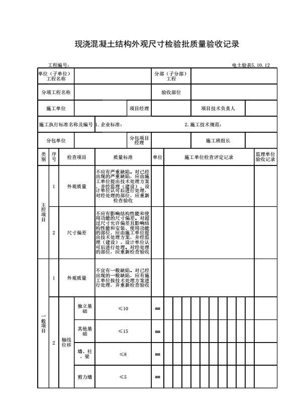 表格名称:电土验表5.10.12 现浇混凝土结构外观及尺寸检验批质量验收记录