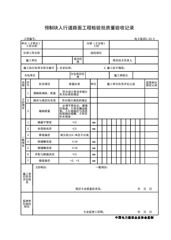 表格名称:电土验表5.24.9 预制块人行道路面工程检验批质量验收记录