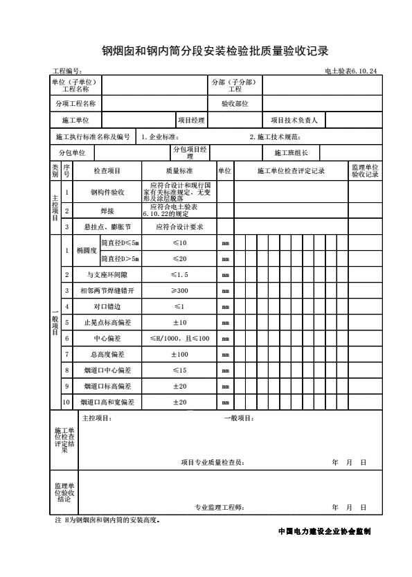 表格名称:电土验表6.10.24 钢烟囱和钢内筒分段安装检验批质量验收记录