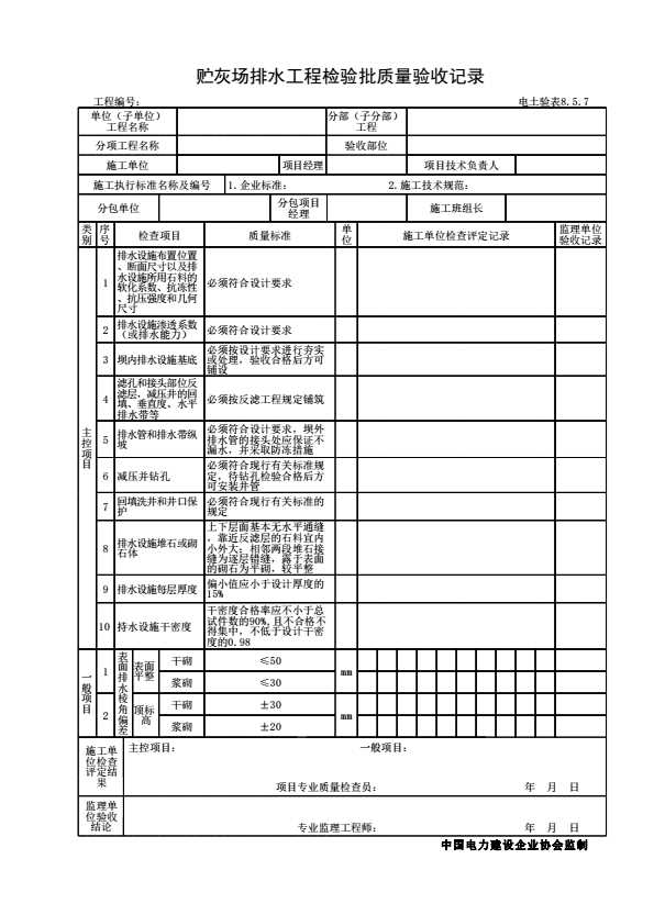 表格名称:电土验表8.5.7 贮灰场排水工程检验批质量验收记录