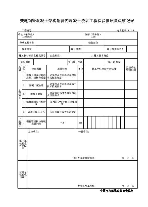 表格名称:电土验表11.2.8 变电钢管混凝士架构钢管内混凝土浇灌工程检验批质量验收记录