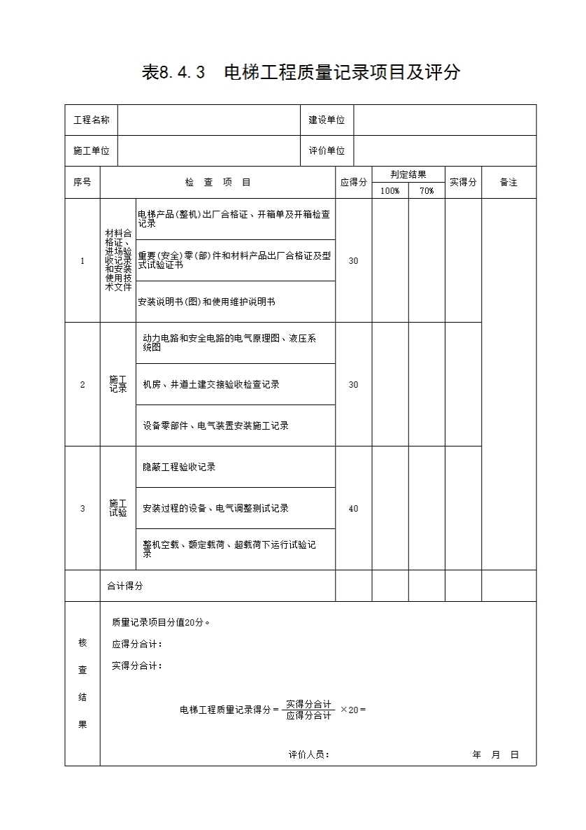表格名称:表8.4.3 电梯工程质量记录项目及评分