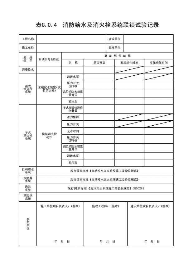表格名称:表C.0.4 消防给水及消火栓系统联锁试验记录