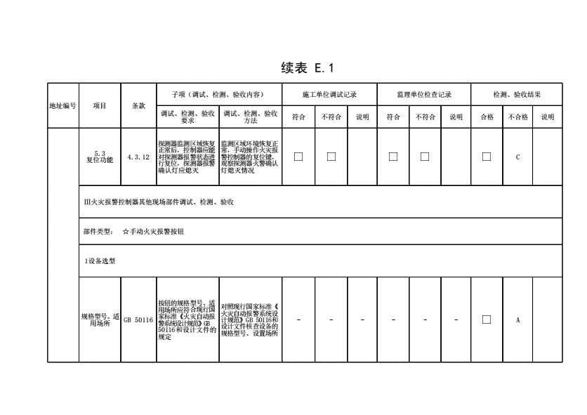 表格名称:表E.1 火灾报警控制器、消防联动控制器、火灾报警控制器(联动型)及其现场配接部件调试、检测、验收记录(续表66)