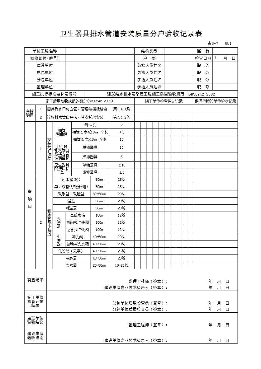 表格名称:6-7 卫生器具排水管道安装质量分户验收记录表