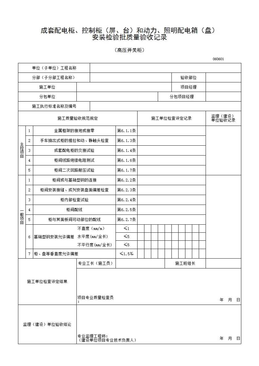 表格名称:成套配电柜、控制柜(屏、台)和动力、照明配电箱(盘)安装检验批质量验收记录