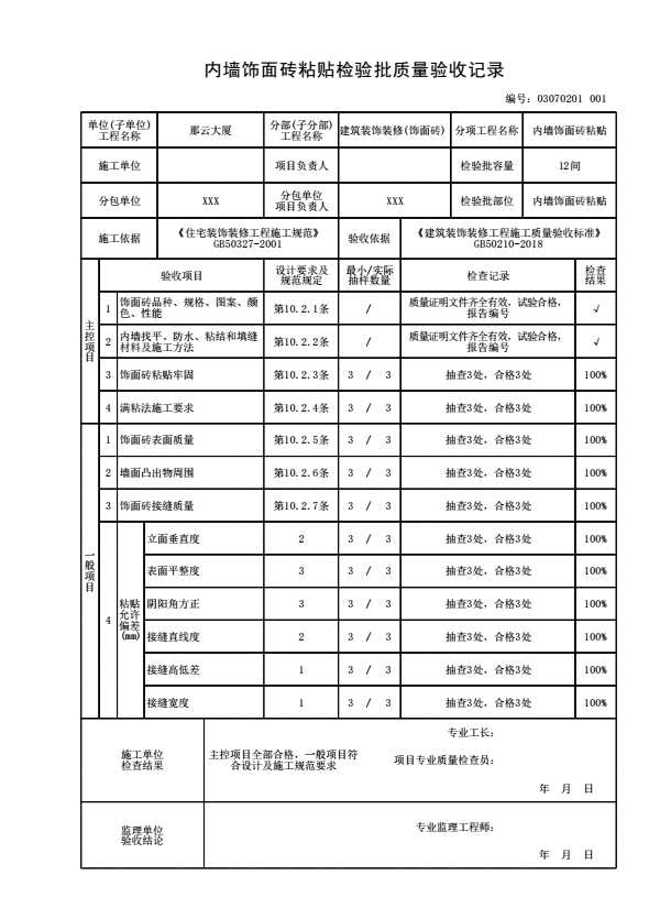 10.2.4 满粘法施工的内墙饰面砖应无裂缝,大面和阳角应无空鼓。