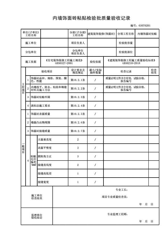 10.2.1 内墙饰面砖的品种、规格、图案、颜色和性能应符合设计要求及国家现行标准的有关规定。