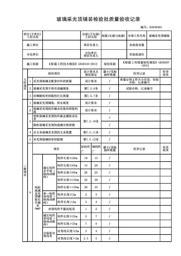 04040401 玻璃采光顶铺装检验批质量验收记录