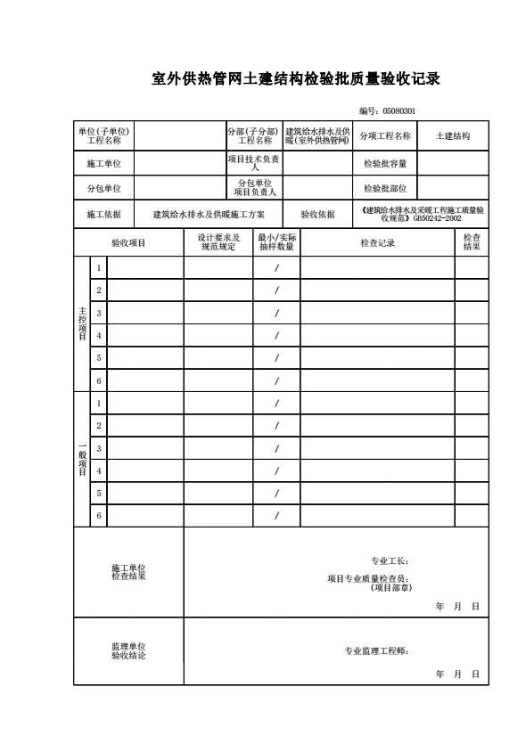 表格名称:05080301 室外供热管网土建结构检验批质量验收记录