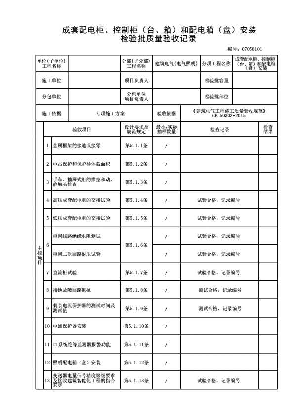 07050101 成套配电柜、控制柜(台、箱)和配电箱(盘)安装检验批质量验收记录