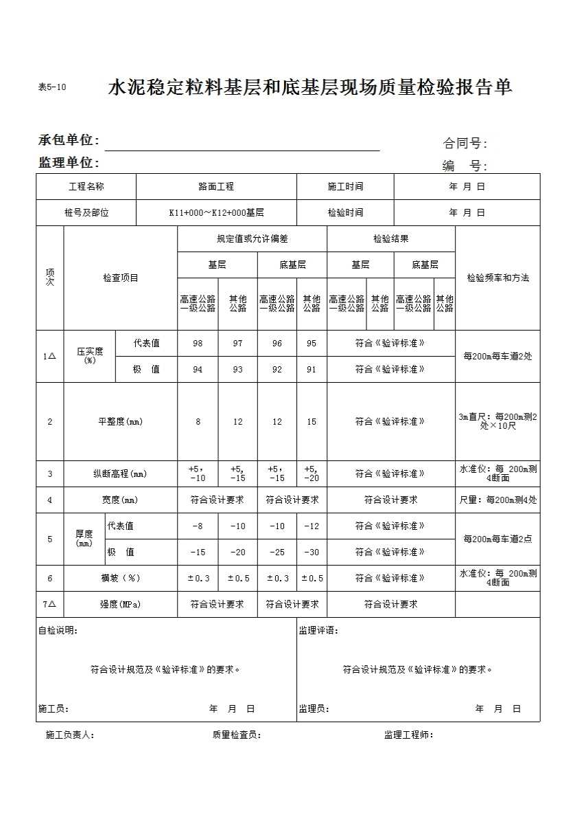 表格名称:表5-10 水泥稳定粒料基层和底基层现场质量检验报告单