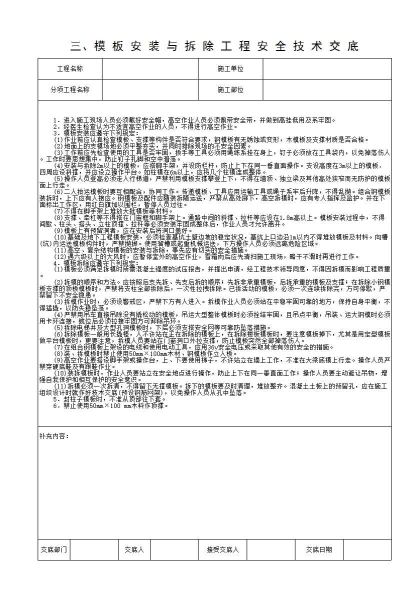 表格名称:03、模板安装与拆除工程安全技术交底