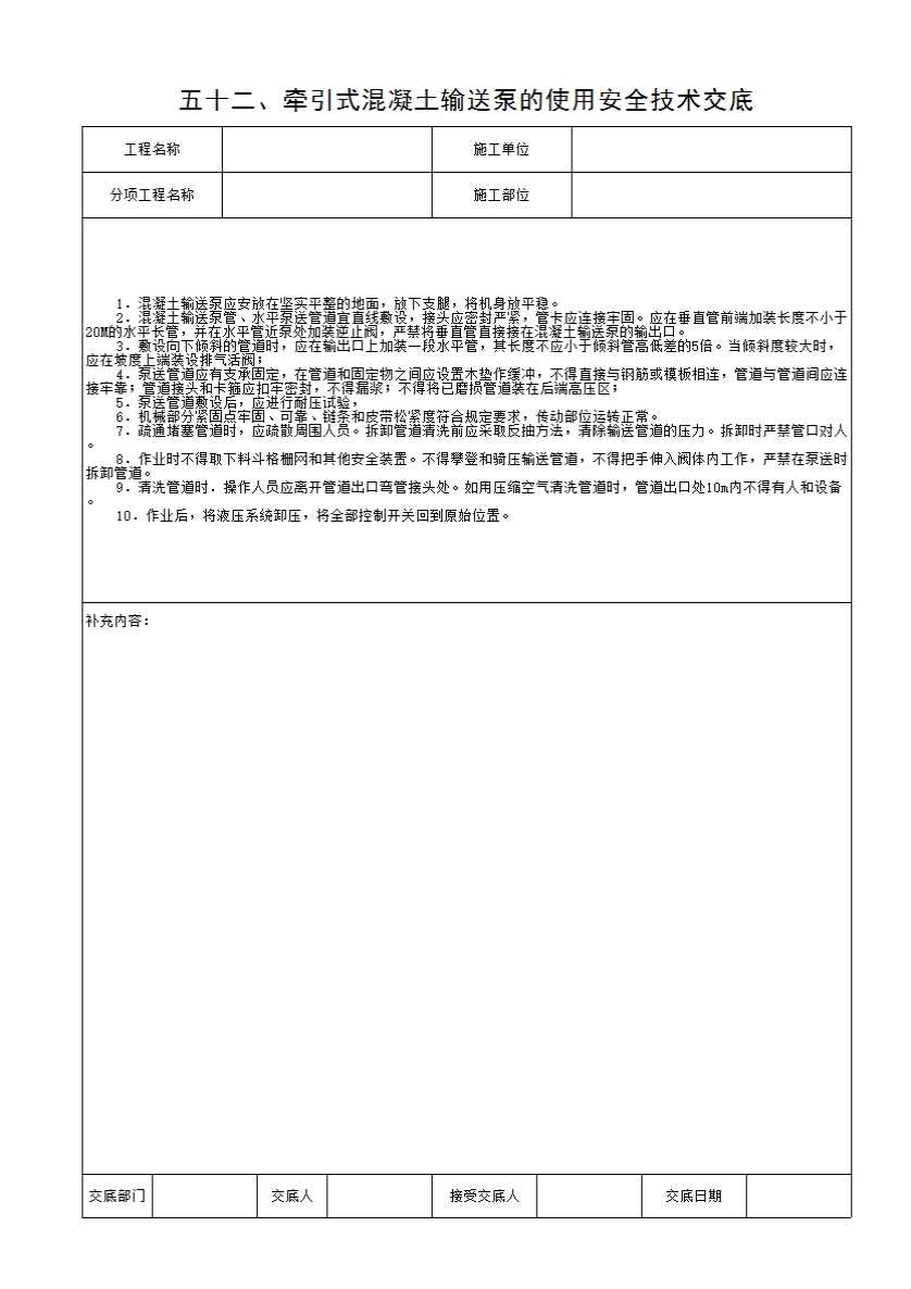 表格名称:52、牵引式混凝土输送泵的使用安全技术交底