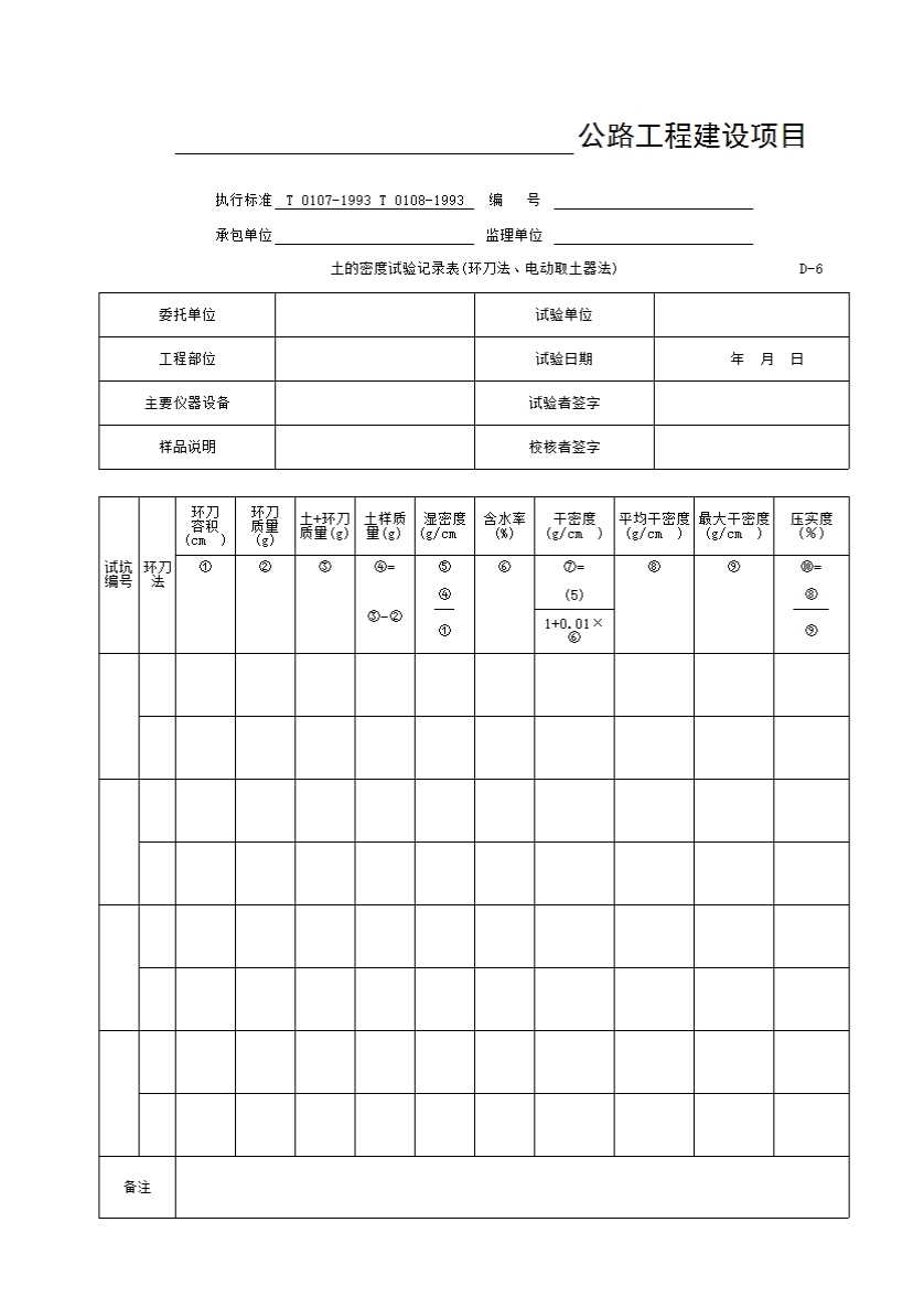 表格名称:D-6 土的密度试验记录表(环刀法、电动取土器法)