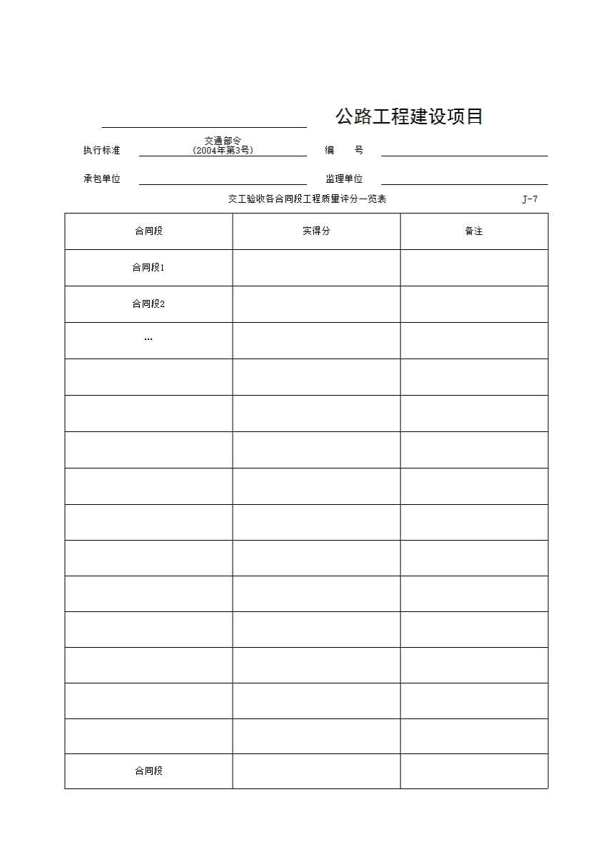 表格名称:J-7表 交工验收各合同段工程质量评分一览表