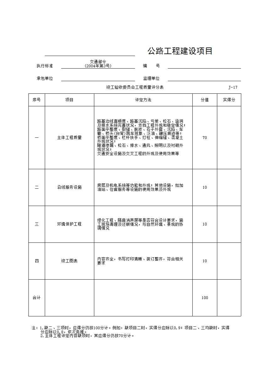 表格名称:J-17表 竣工验收委员会工程质量评分表