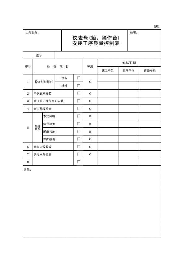 表格名称:E01 仪表盘(箱、操作台)安装工序质量控制表