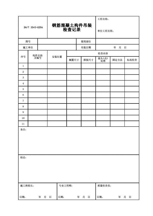 SH/T 3543-G206 钢筋混凝土构件吊装检查记录