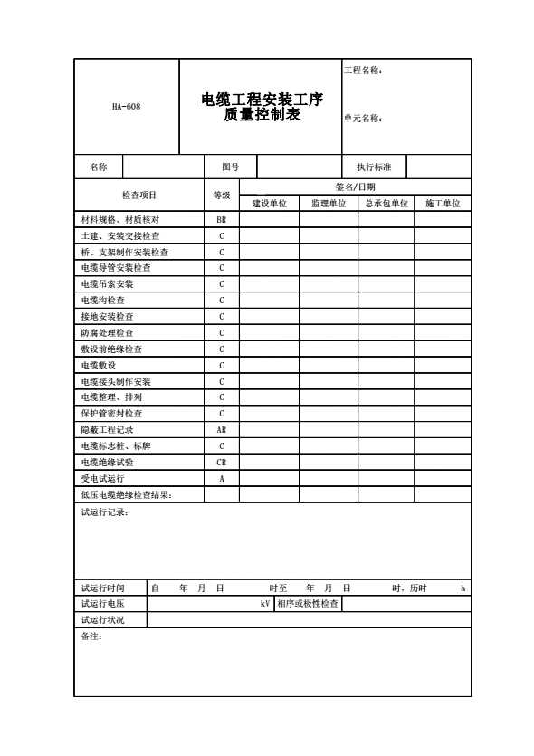 表格名称:HA-608 电缆工程安装工序质量控制表