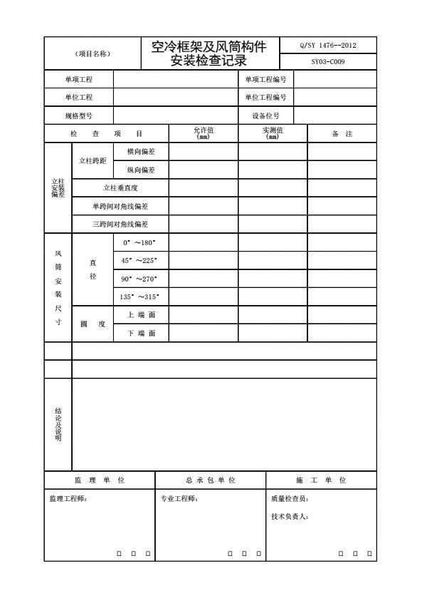表格名称:SY03-C009 空冷框架及风筒构件安装检查记录