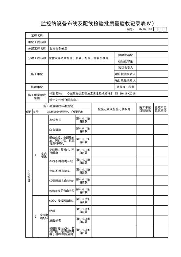 表格名称:07160101 监控站设备布线及配线检验批质量验收记录表(Ⅴ)