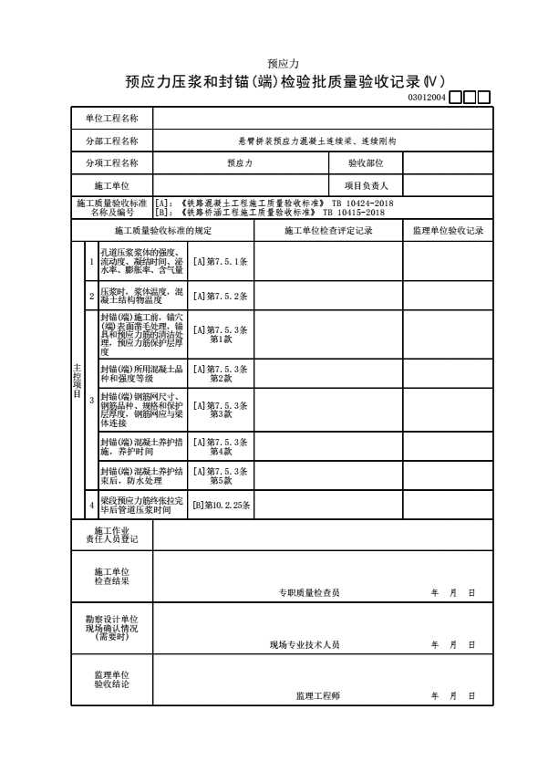 表格名称:03012004 预应力压浆和封锚(端)检验批质量验收记录(Ⅳ)