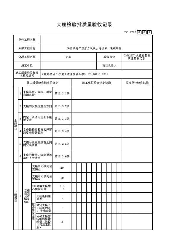 表格名称:模板及支架分项检验批符合悬臂浇筑、支架法现浇预应力混凝土连续梁、连续刚构分部下模板及支架的表格