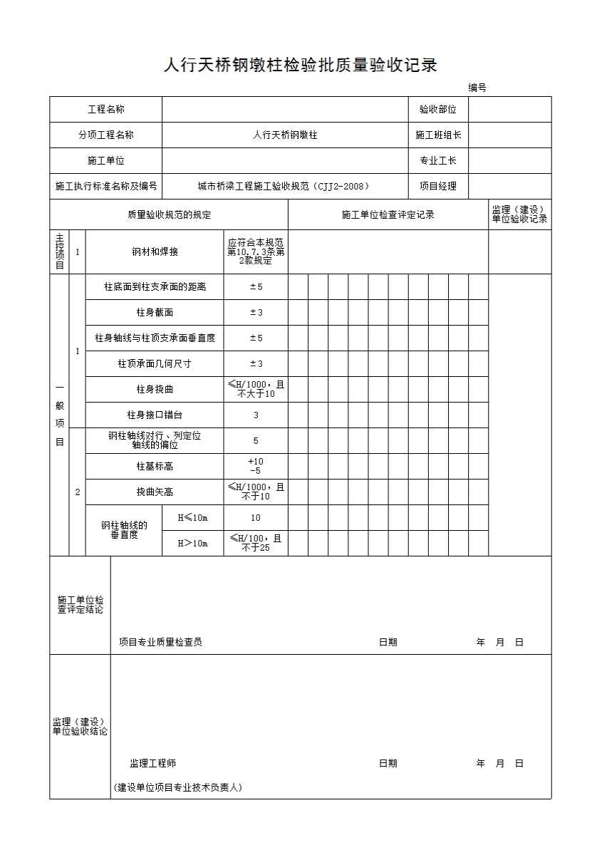 表格名称:2 人行天桥钢墩柱检验批质量验收记录
