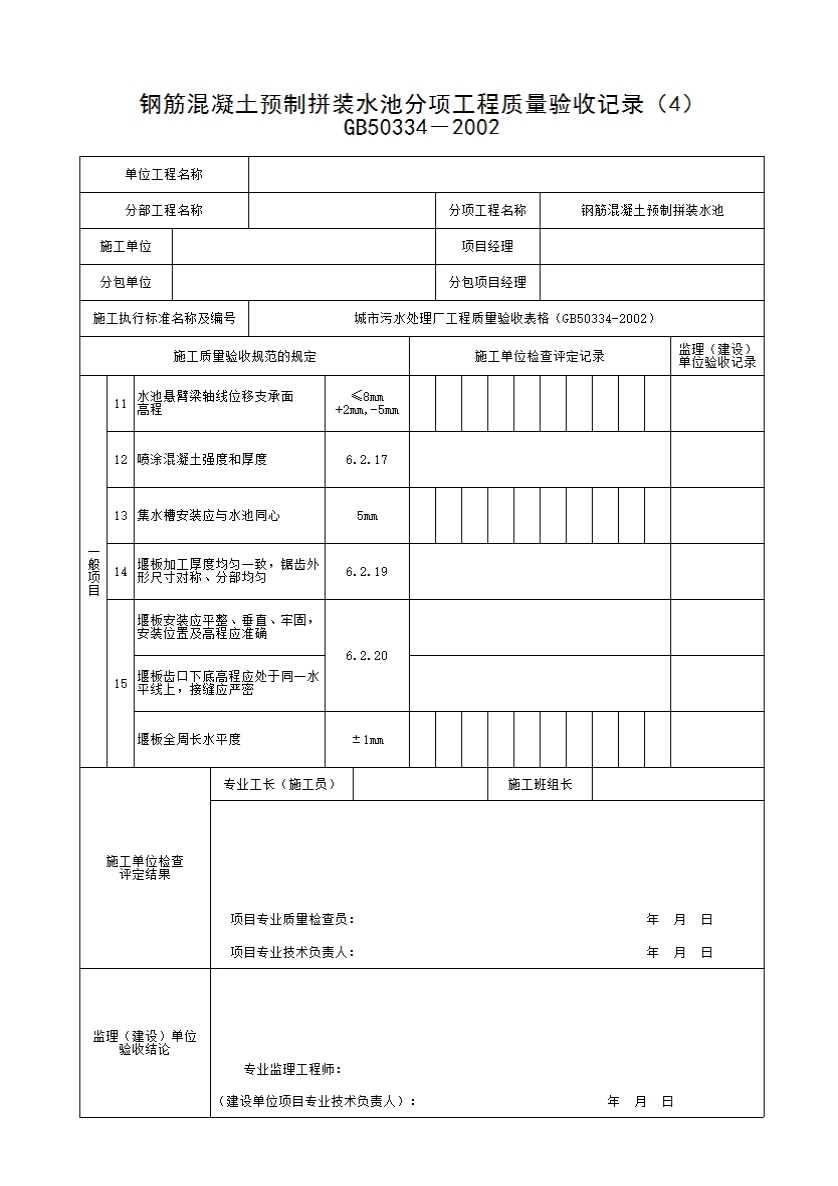 表格名称:20 钢筋混凝土预制拼装水池分项工程质量验收记录