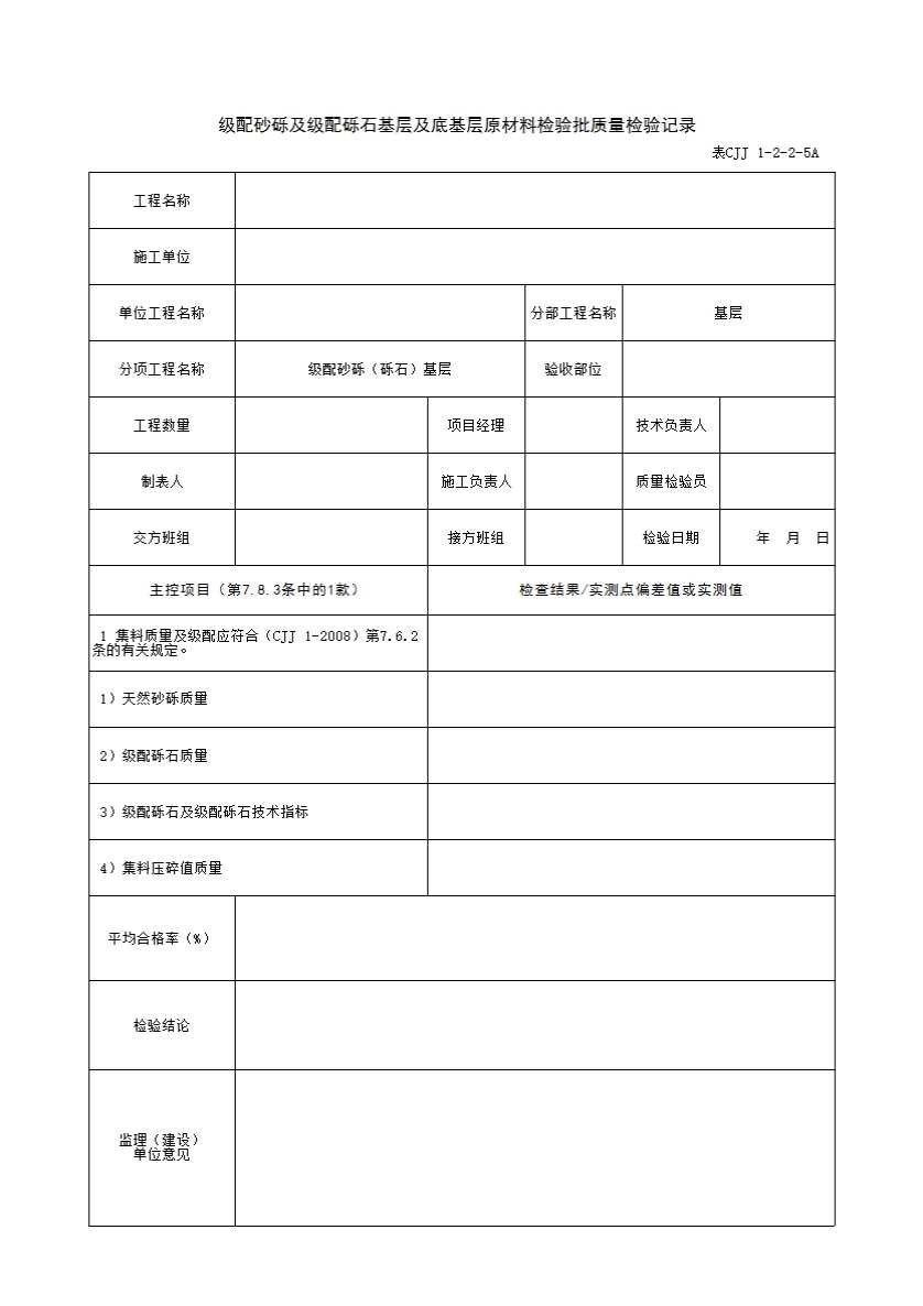 表CJJ 1-2-2-5A 级配砂砾及级配砾石基层及底基层原材料检验批质量检验记录