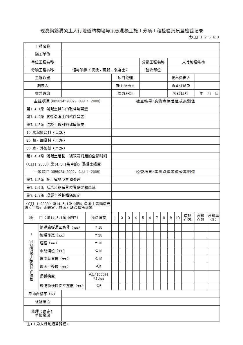 表格名称:表CJJ 1-2-6-4C3 现浇钢筋混凝土人行地道结构墙与顶板混凝土施工分项工程检验批质量检验记录