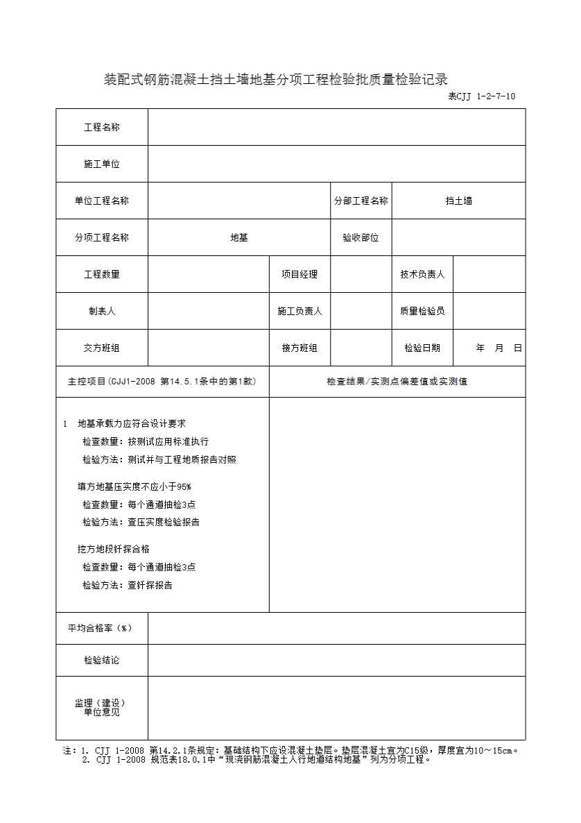 表CJJ 1-2-7-10 装配式钢筋混凝土挡土墙地基分项工程检验批质量检验记录