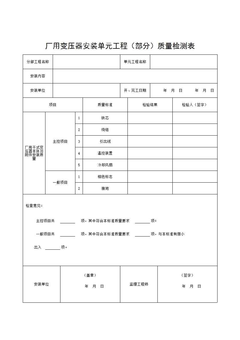 表格名称:厂用变压器安装单元工程(部分)质量检测表2