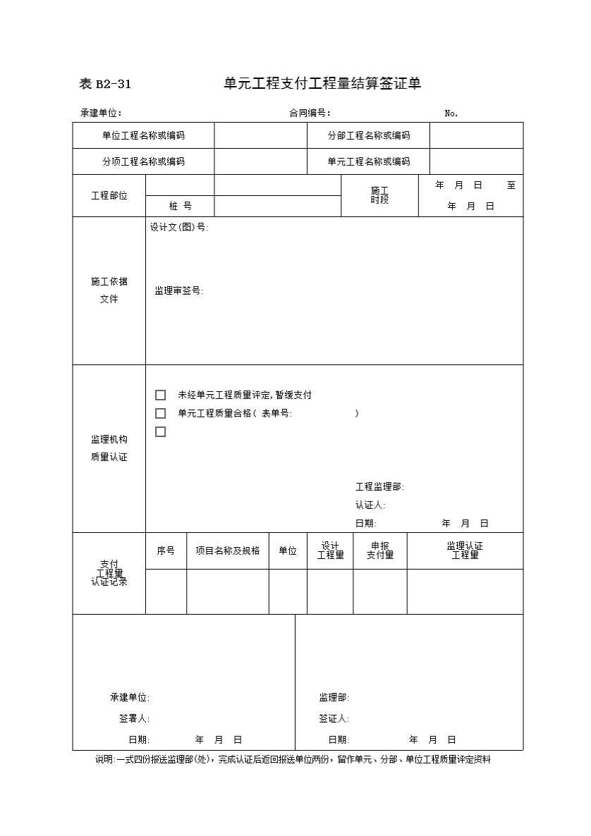 表格名称:B2-31 单元工程支付工程量结算签证单