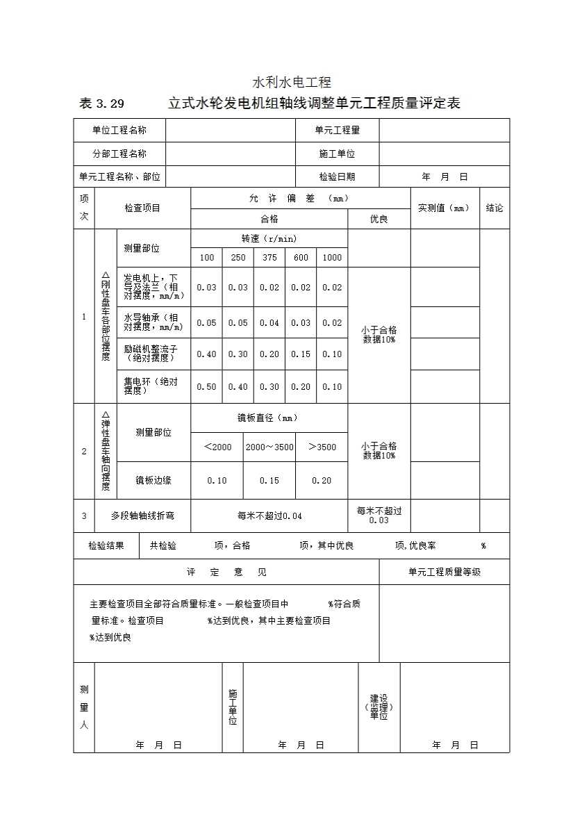 表格名称:表3.29 立式水轮发电机组轴线调整单元工程质量评定表