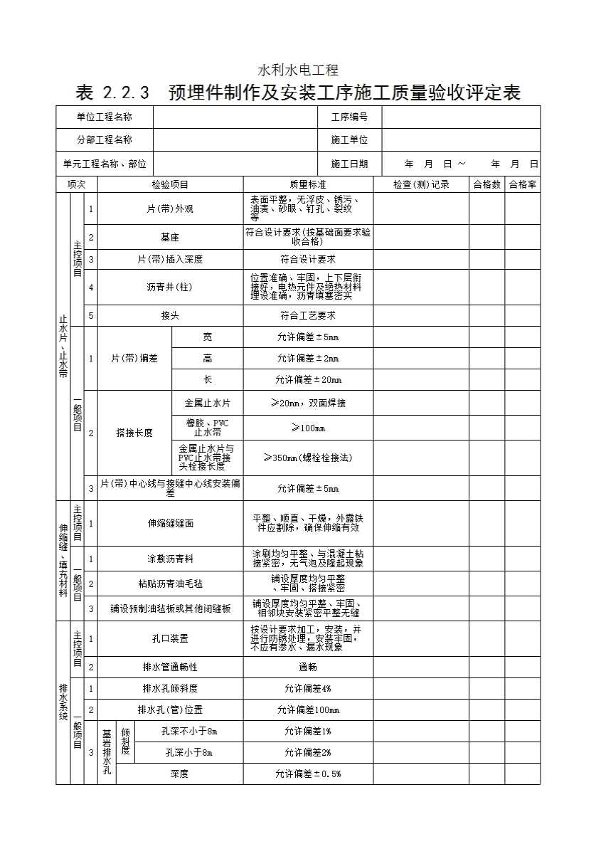 表 2.2.3 预埋件制作及安装工序施工质量验收评定表