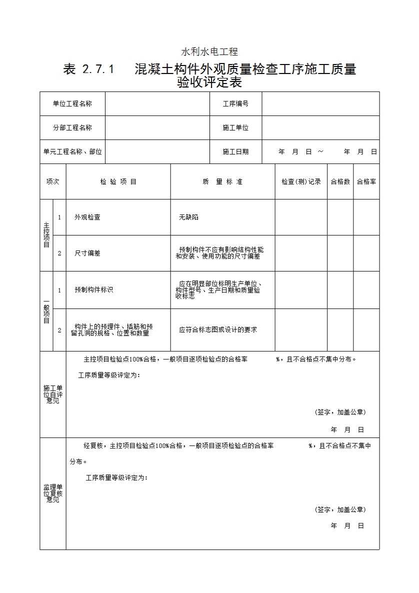 2.7.1   混凝土构件外观质量检查工序施工质量验收评定表