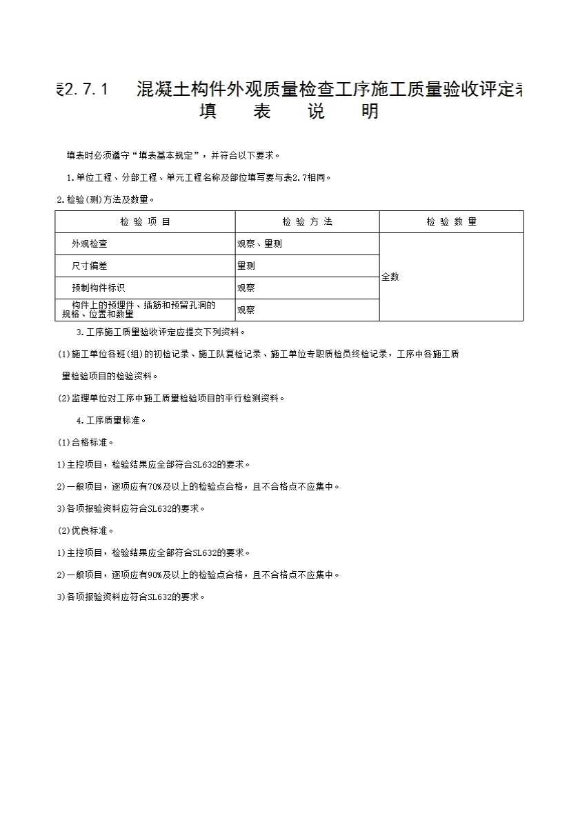 表2.7.1 混凝土构件外观质量检查工序施工质量验收评定表