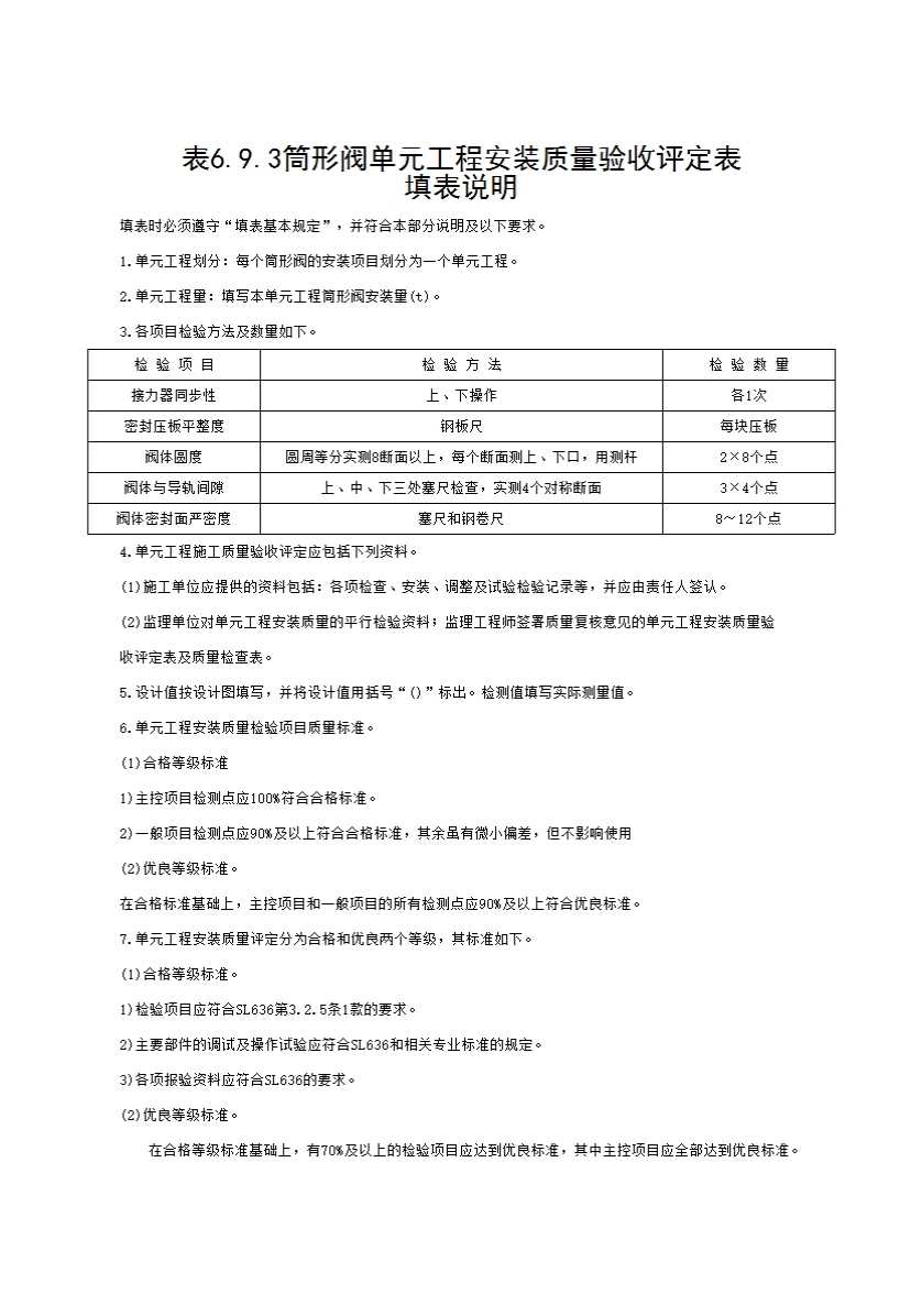 表6.9.3 筒形阀单元工程安装质量验收评定表