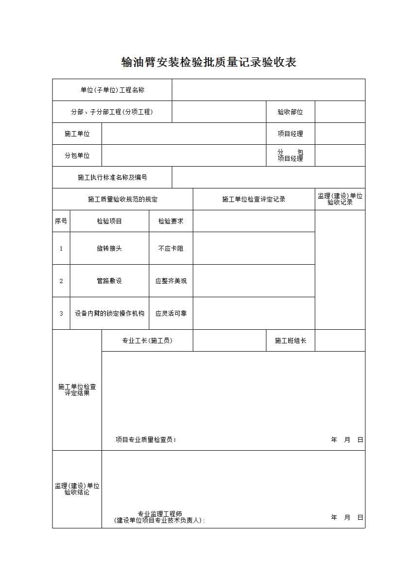 输油臂安装检验批质量记录验收表