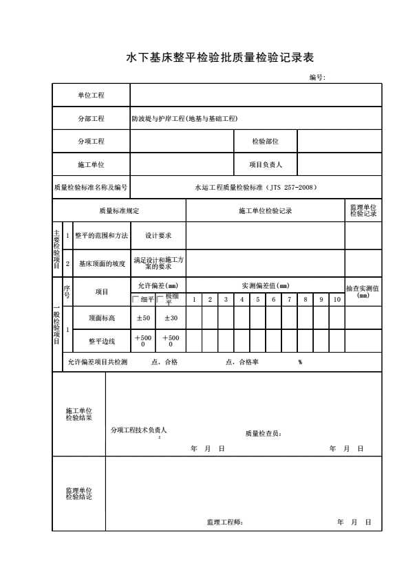 表格名称:水下基床整平检验批质量检验记录表