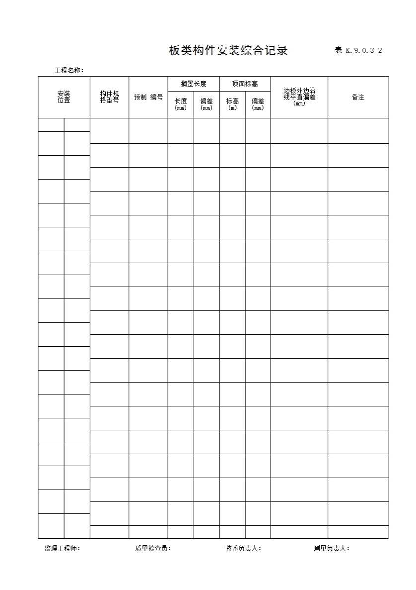 表格名称:表K.9.0.3-2 板类构件安装综合记录