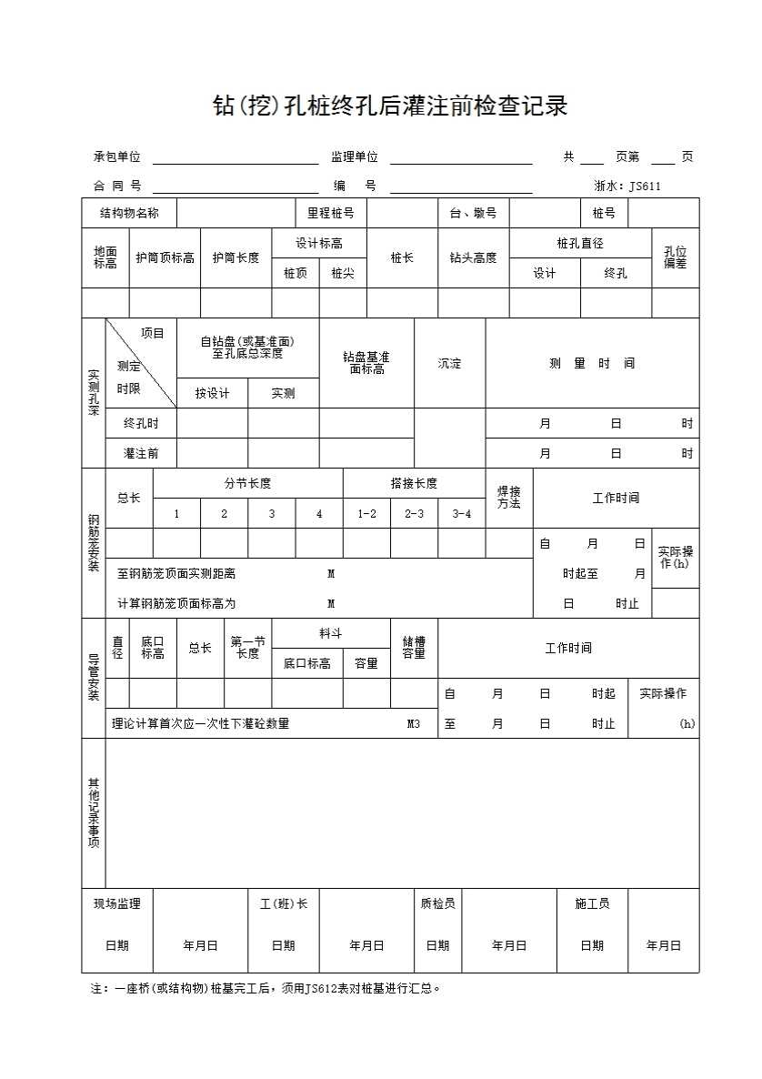 表格名称:011 钻(挖)孔桩终孔后灌注前检查记录