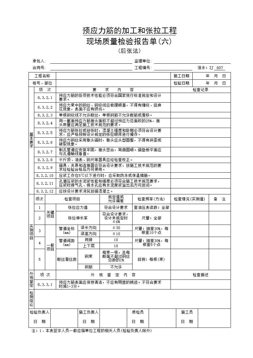 表格名称:浙水:ZJ807 预应力筋的加工和张拉工程现场质量检验报告单(六)