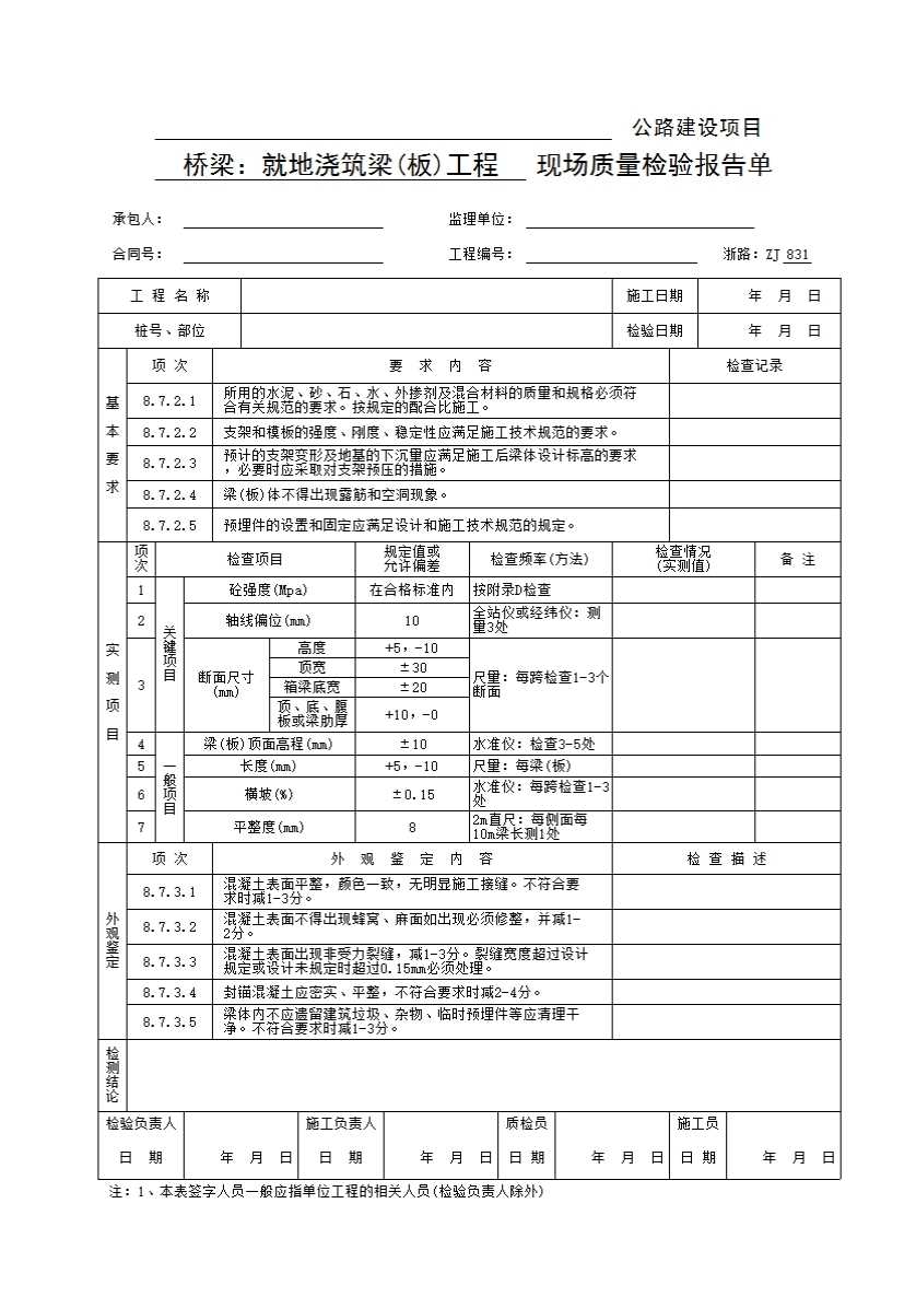 表格名称:浙路ZJ831 桥梁:就地浇筑梁(板)工程现场质量检验报告单